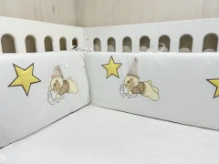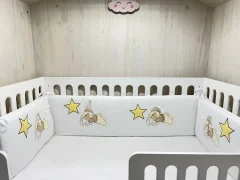 Освен защита, ще осигури красиво и стилно пространство и ще обгърне малкия човек в мекотата на чистия органичен памук. А прекрасните десени ще го пренесат в приказния свят на сънищата. Стандарно обиколникът се състои от три части, като размерът може да изберете в падащото мено. За изработка на повече части, моля свържете се с нашия екип. Посоченият модел е изработен с апликирани и бродирани мечета и звездички.